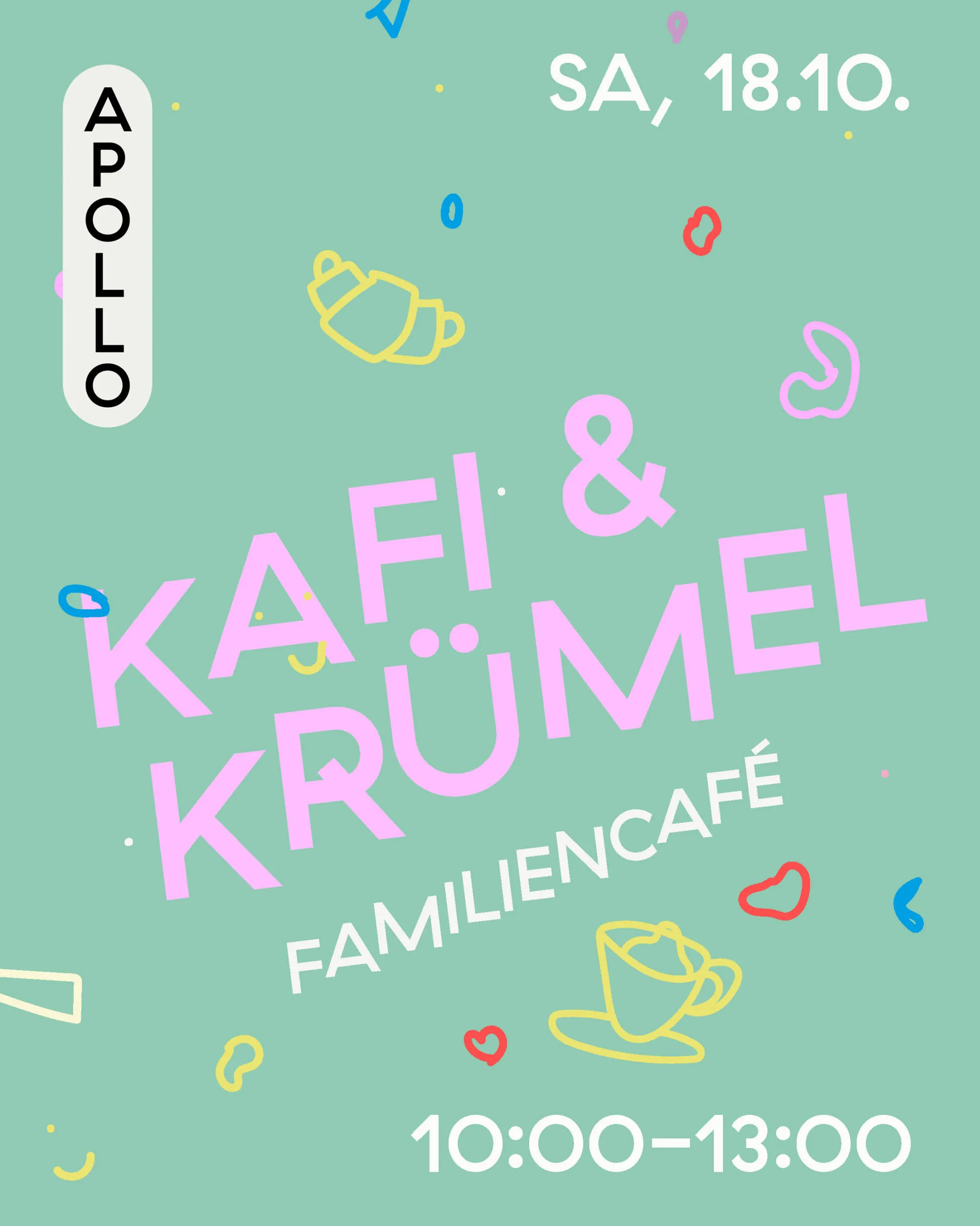 Regelmässig verwandeln wir unser KULTURHAUS APOLLO für ein paar Stunden in ein gemütliches Familiencafé. Euch erwartet ein Buffet mit hochwertigen Leckereien, das im Eintritt (CHF 10 |15 | 20 Familienpreis) inbegriffen ist. Getränke und feinster Kaffee sind zusätzlich an der Bar erhältlich.